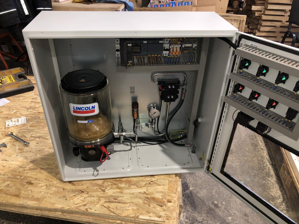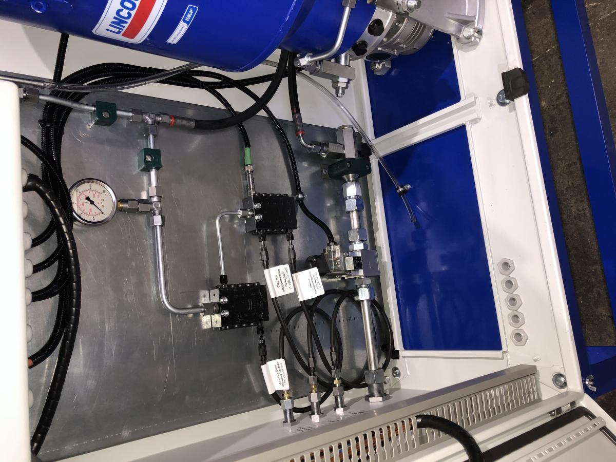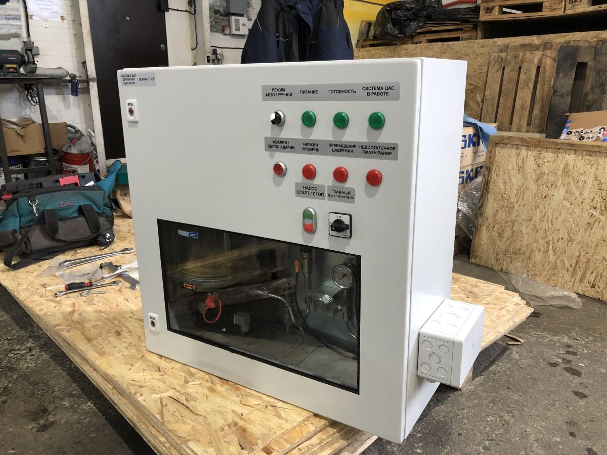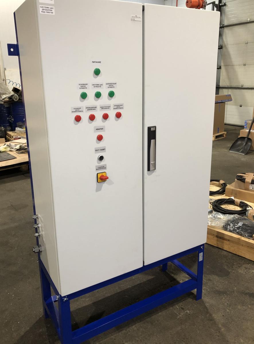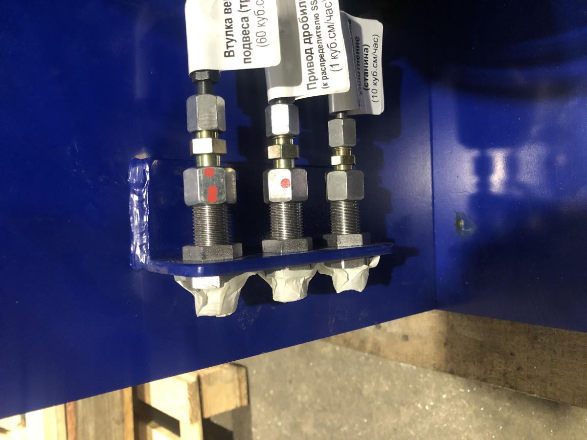 Система смазки предназначена для непрерывной подачи под давлением жидкой смазки к смазываемым узлам дробилки. При этом одновременно со смазкой трущихся поверхностей от них отводиться тепло.